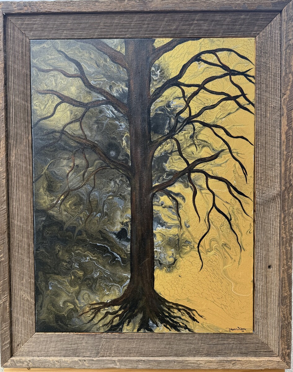 VERY SOLEMN TREE WITH VERY INTRICATE MOODY BACKGROUND PUTTING THE VIEWER LOOKING DEEP TO SEE WHAT IS REVEALED. FRAMED WITH 120 YEAR OLD BARNWOOD