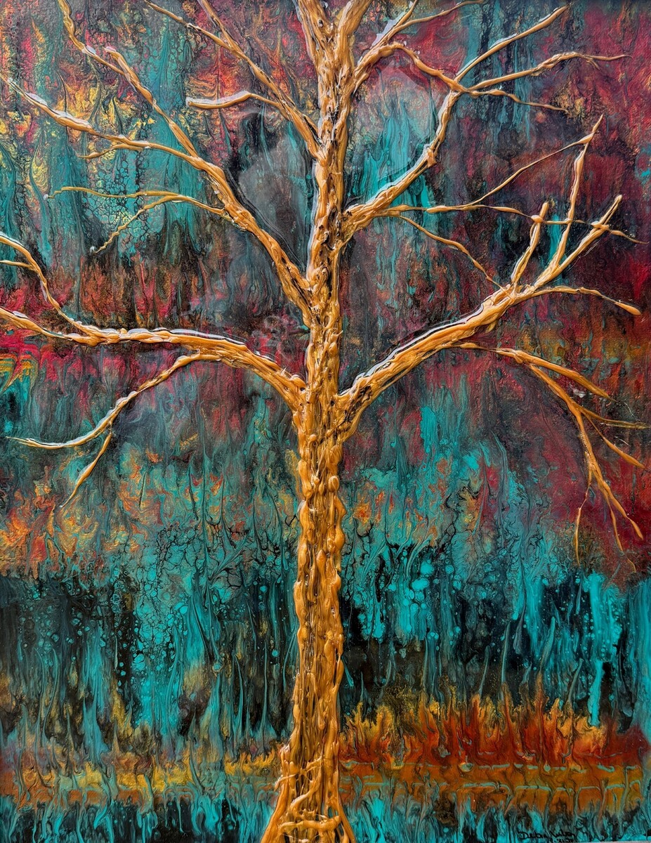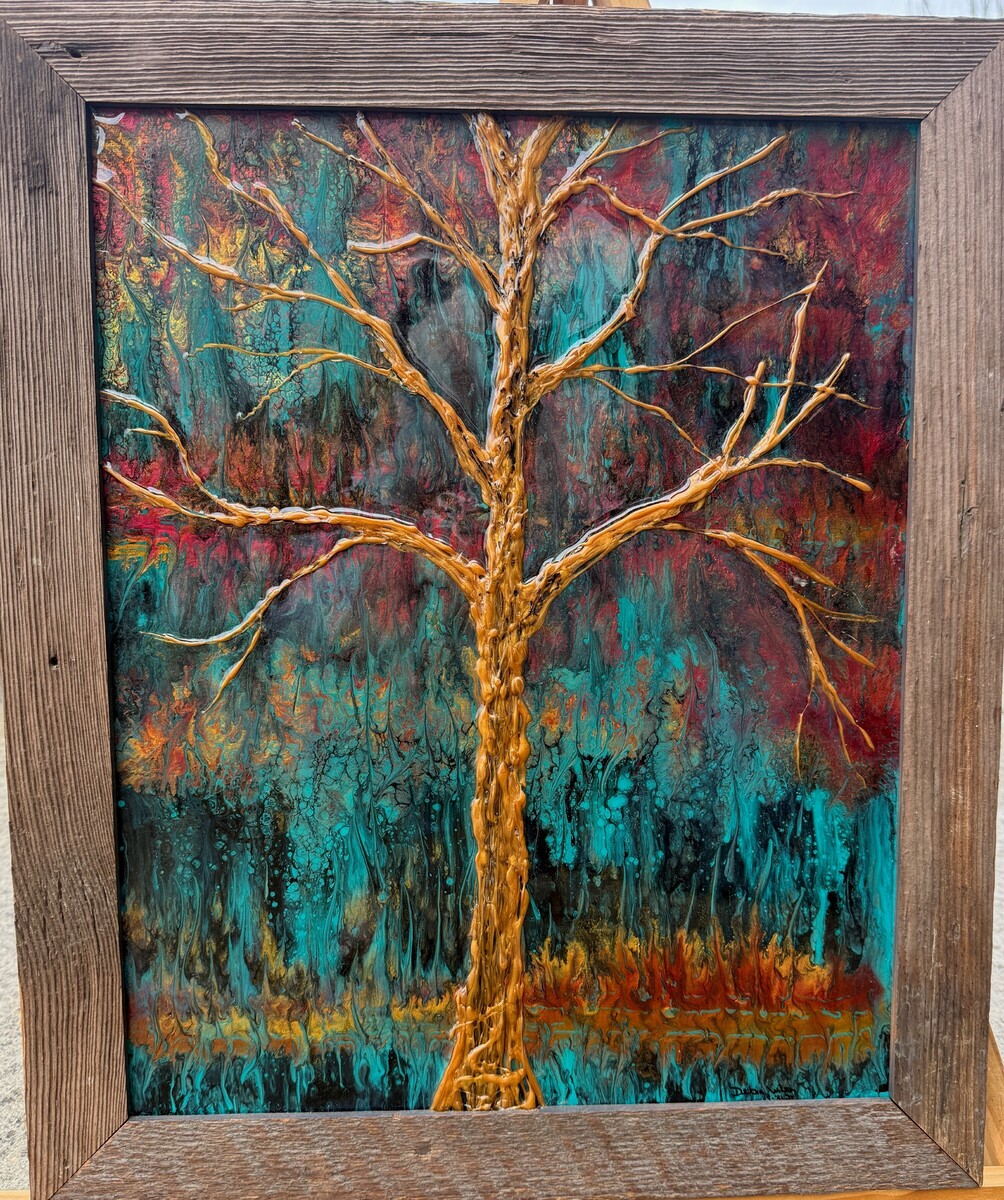 IN THE FIRE – A BEAUTIFUL TEXTURED TREE ON TOP OF A ACRYLIC BACK GROUND THAT APPEARS TO BE ON FIRE. FRAMED WITH 120 YEAR OLD BARN WOOD