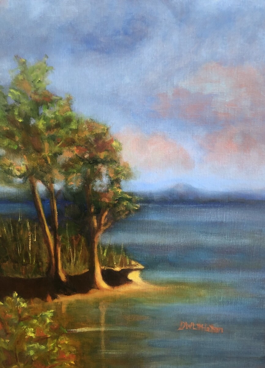 View of Smith Mountain from Dixie Sailing Club on Lake Martin near Alexander City, AL. Painted en plein air in October, 2026 and completed in studio.