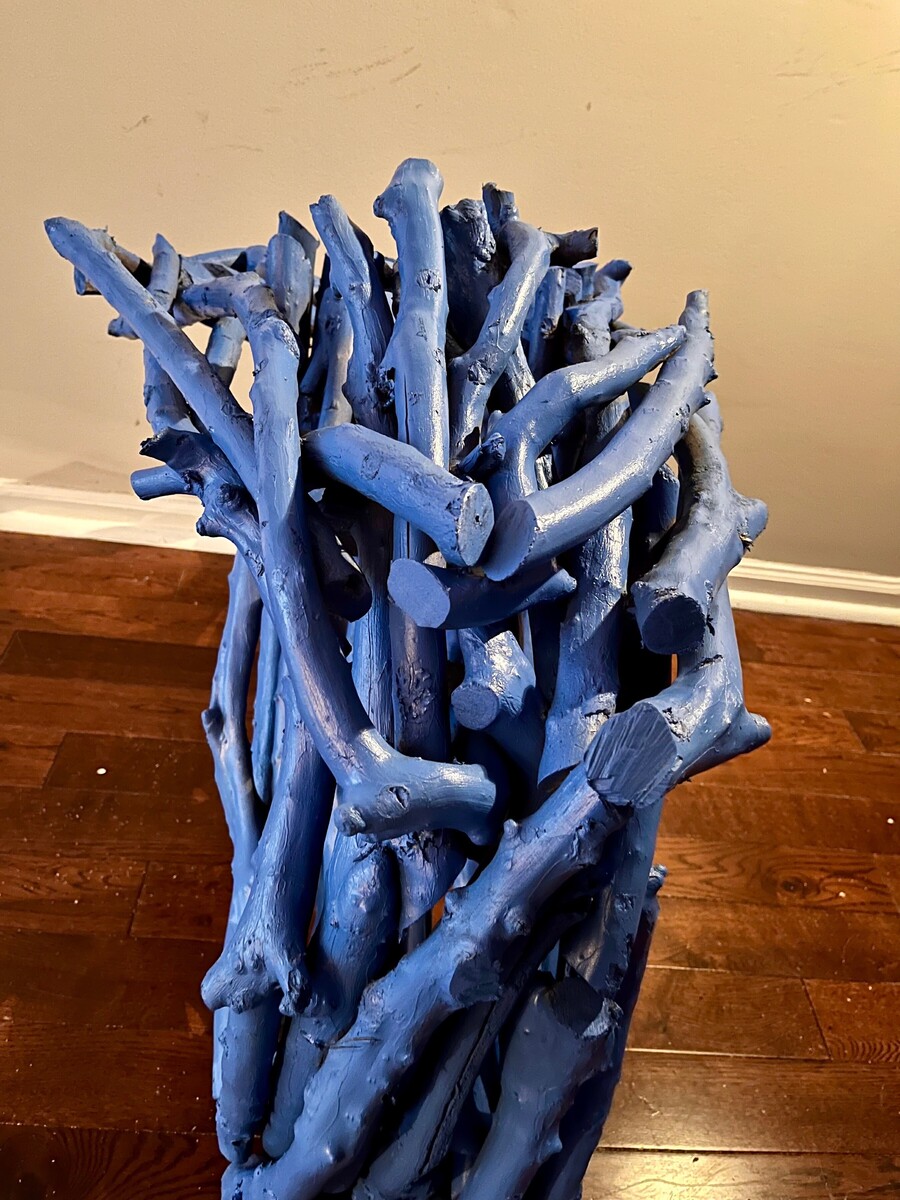 A wood branch sculpture depicting a person crouched down with their head in between their arms and knees. A statement about the lonliness of depression.