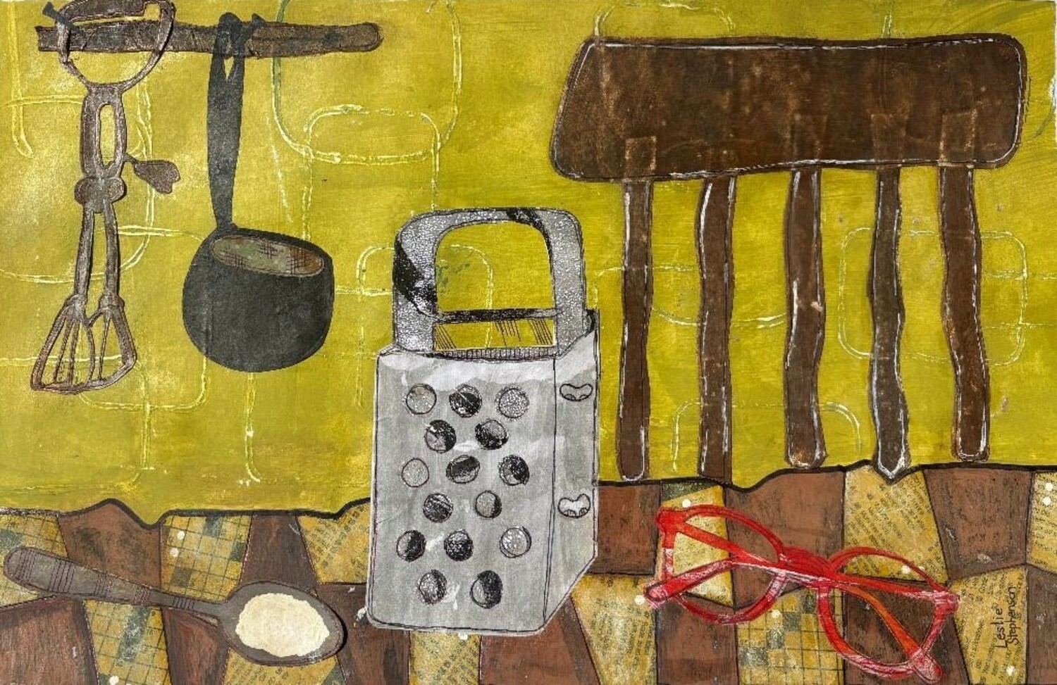 This is a mixed media piece made from acrylic paint, ink, a yellowed crossword puzzle book, gel-prints, a sanding block, and all manner of bits and bobs of paper. It depicts a moment in my mother’s kitchen where I frequently sat at the table with my parents to share the day’s events. My parents have since both passed away and although I can no longer enjoy an afternoon visit with them, my art allows me to revisit this experience time and time again.