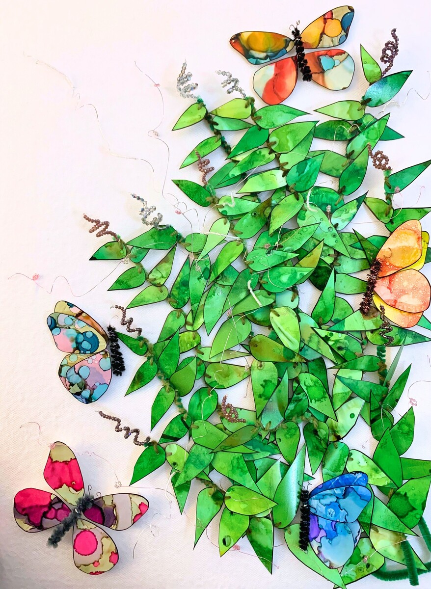 Spring Time is created with alcohol ink paintings. The pieces are hand cut and outlined with sharpie. The butterfly bush is created with pipe cleaners, wire, yarn, beads, and paintings. The butterflies are paintings, wire, and pipe cleaners.