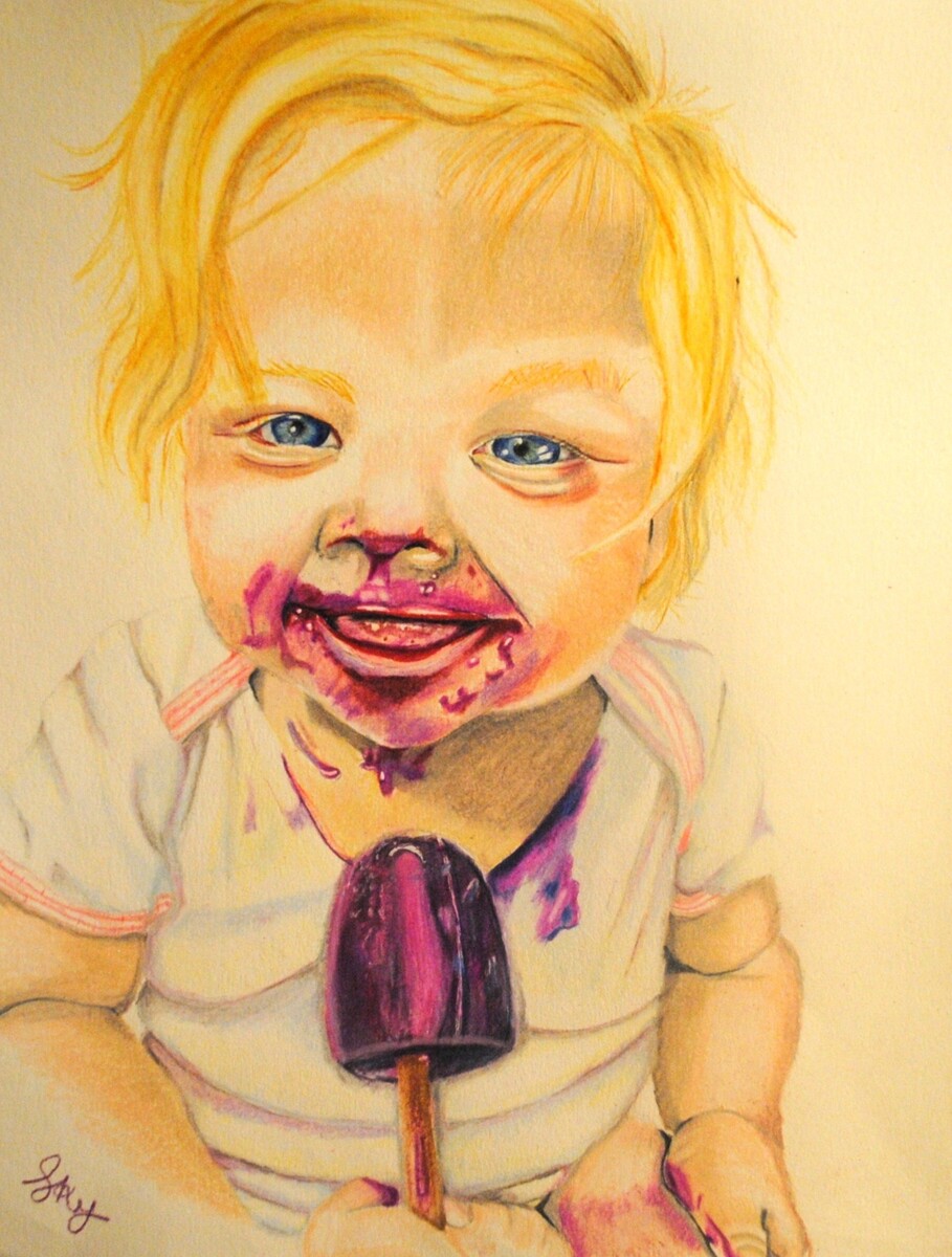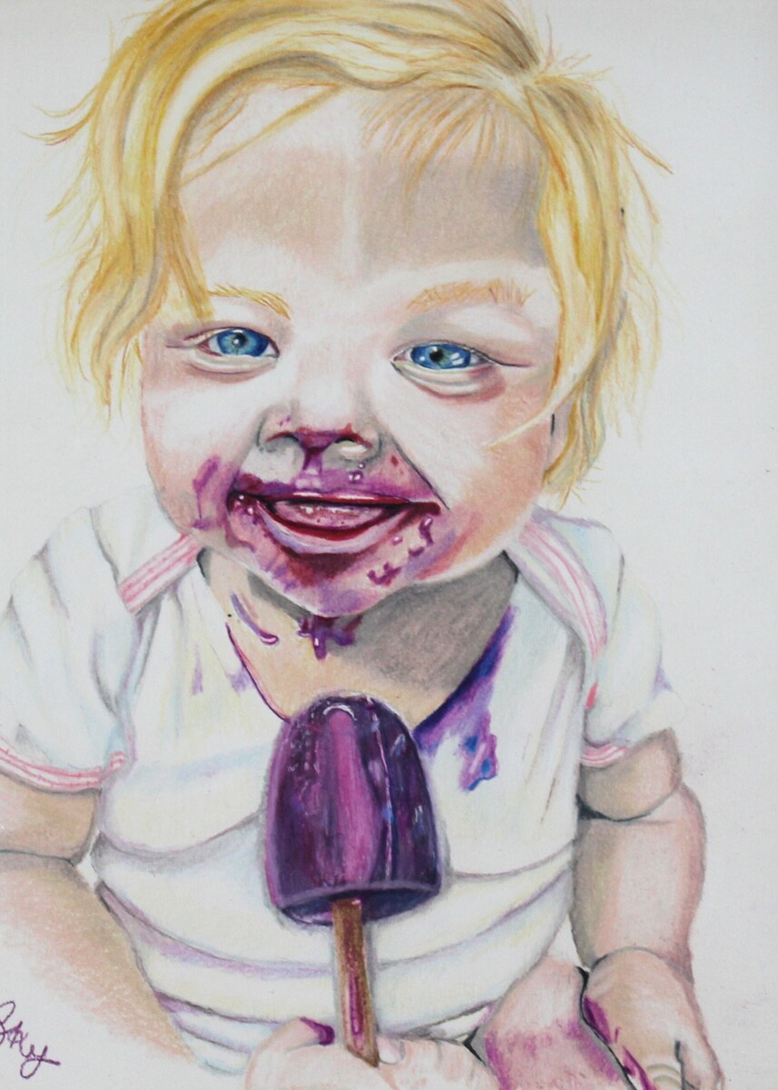 This is my daughter, and it was inspired by the song ‘Wide Open Spaces’. It is colored pencil on paper. I loved the purples, and playing around with the color.