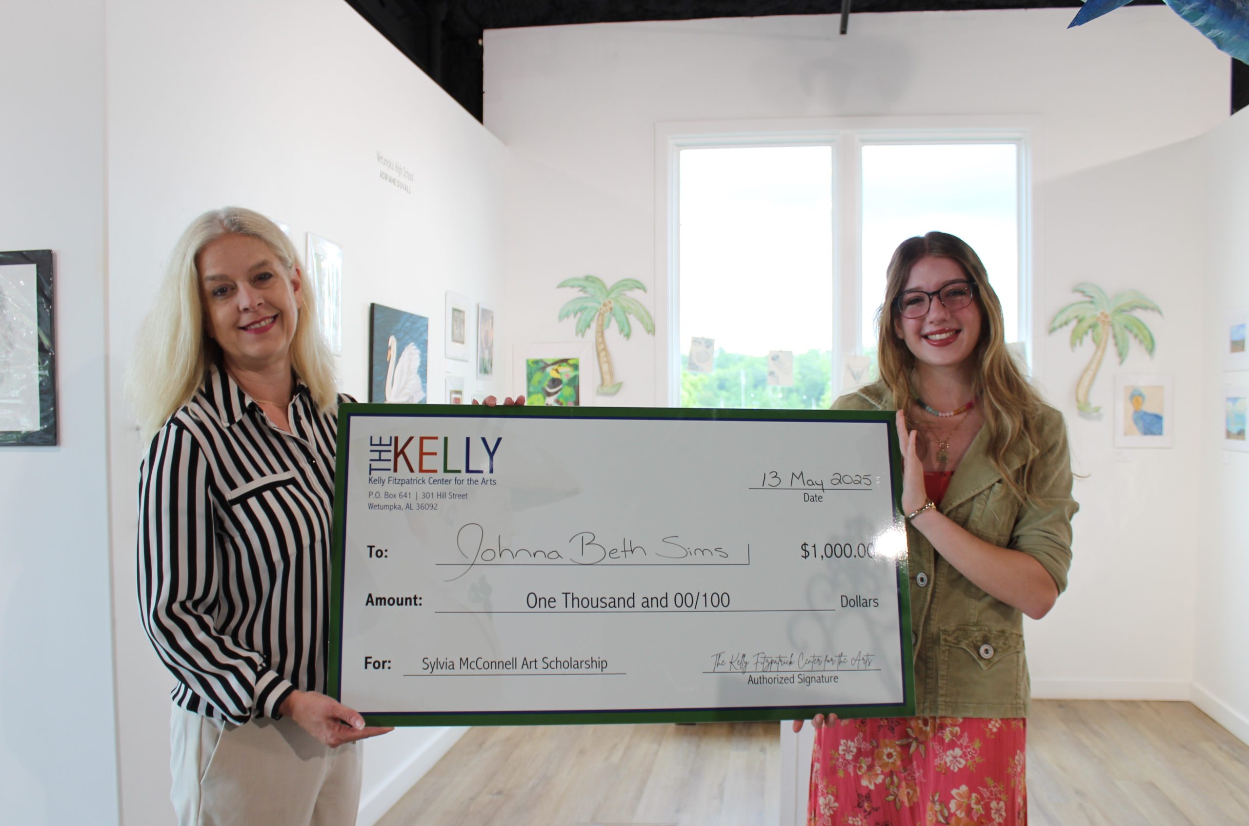 The $1000 scholarship is called the Sylvia McConnell Scholarship for Art in honor of the late Sylvia McConnell of Wetumpka. Sylvia was one of the founding board members of The Kelly and served the Board as an officer for a number of years. She supported The Kelly by active participation in all its events and experiences, by sponsorships, exhibiting her art collection, purchasing art, and volunteering as a docent.